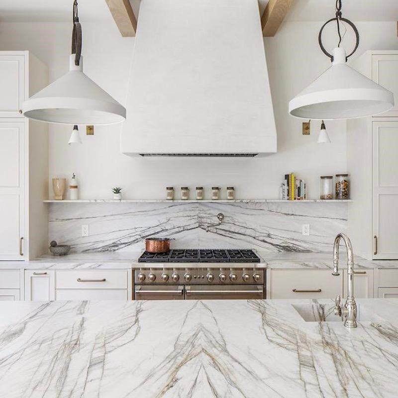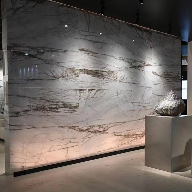 NaturalThis natural white marble sourced from quarries in Italy. It is characterized by a luminous white to off-white background, intersected by a dynamic network of brown and grey veining. The pattern ranges from fine, thread-like lines to broader, more concentrated flows, giving each slab a unique geological signature. A notable feature of this stone is its translucency, which allows for creative lighting applications.